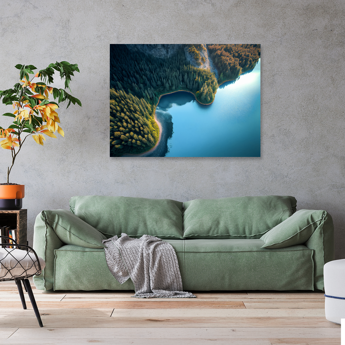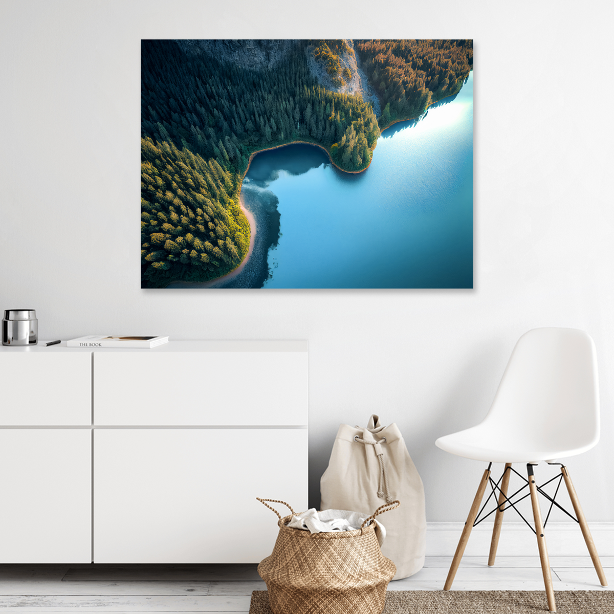 Das Luftbild präsentiert einen Wald, der nahtlos an das Ufer eines Sees grenzt. Die außergewöhnliche Perspektive fängt die beeindruckende Schönheit der Natur ein und verleiht jedem Raum eine besondere Atmosphäre. Besonders faszinierend ist das Zusammenspiel von Lichtreflexen auf der Wasseroberfläche und den Schatten, die sich über Teile des Waldes legen und so eine spannende Dynamik erzeugen. Fotografiert wurde dieses Bild von Matt Bango. Matt ist Natur-, Wildlife- und Reisefotograf aus Austin, Texas (USA).