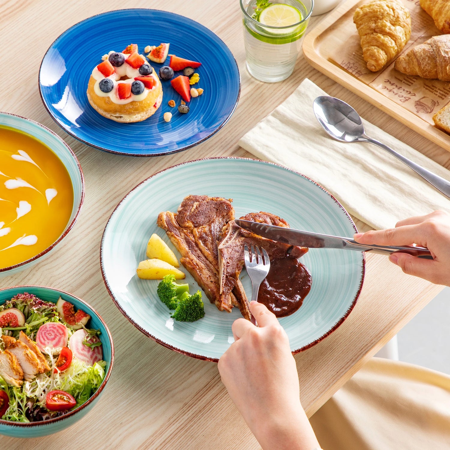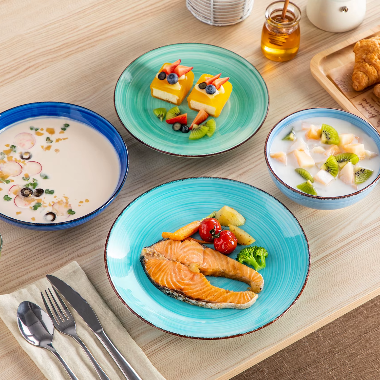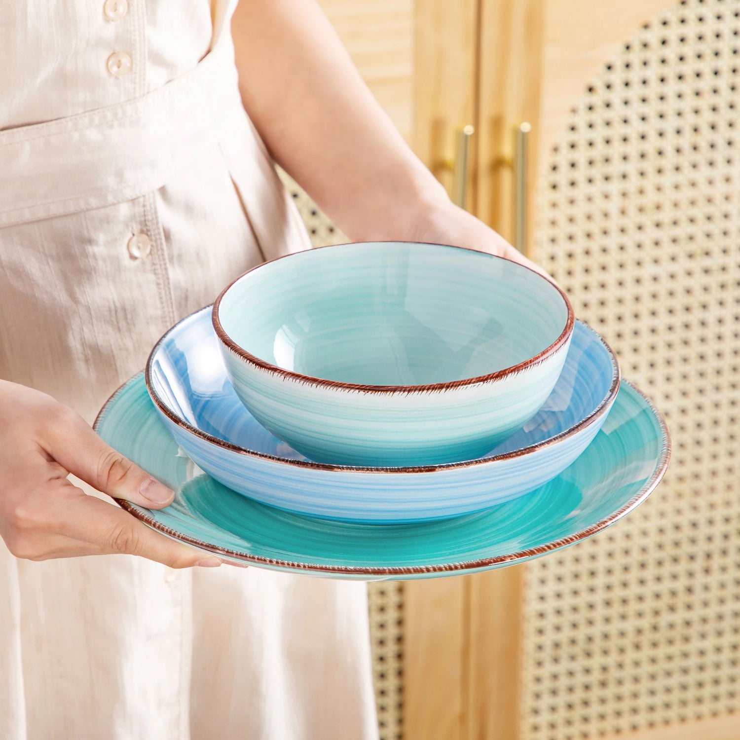 Das Geschirr überzeugt durch seine fein gearbeitete Oberfläche und schöne Farbgebung. Jeder Teller und jede Schüssel wirken handgemacht und einzigartig. Das verleiht dem gedeckten Tisch eine warme, authentische Ästhetik, die zeitlos modern wirkt.