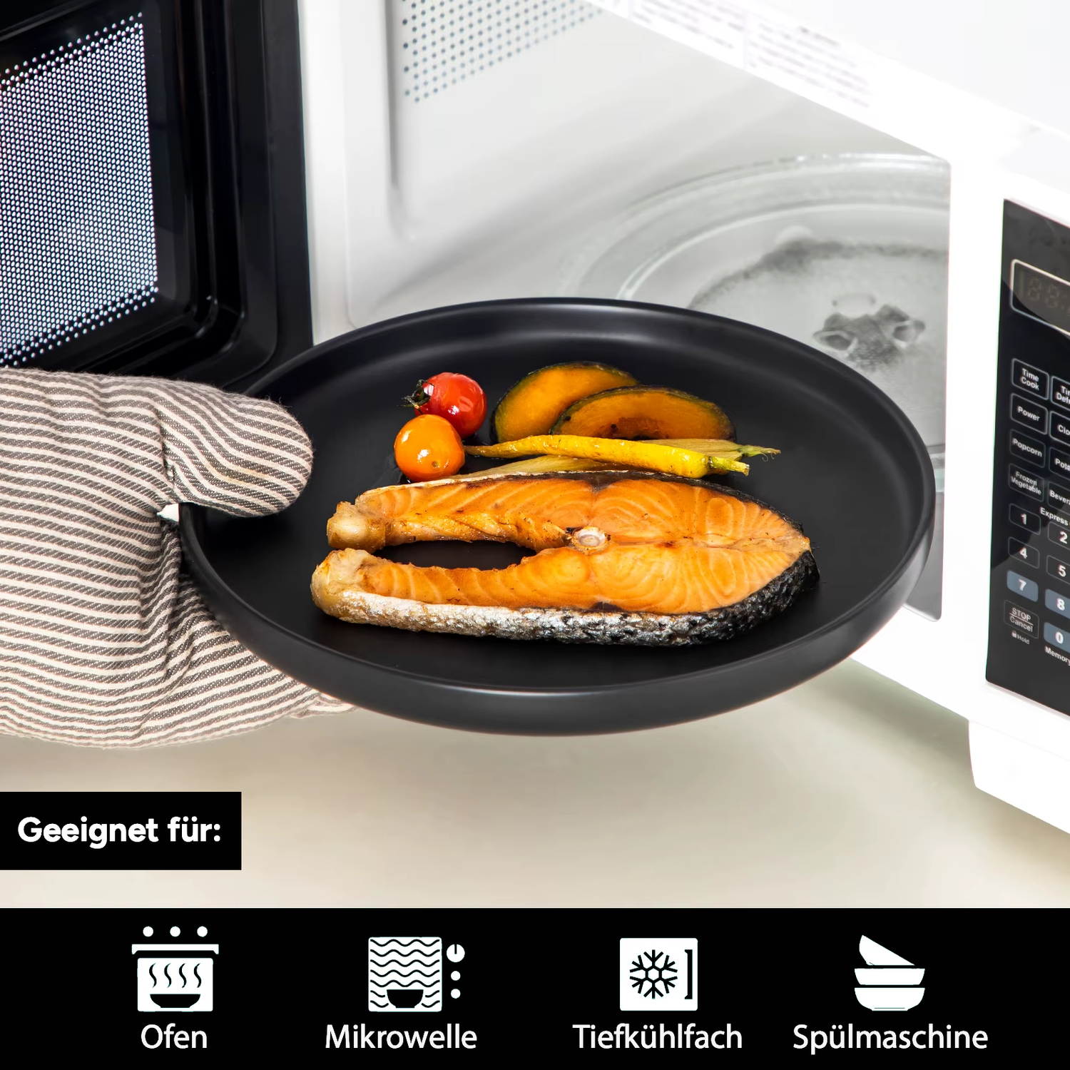 Das robuste Keramikgeschirr aus Steingut ist hochwertig verarbeitet und für den Einsatz in der Spülmaschine sowie der Mikrowelle geeignet. Die Oberfläche ist absolut kratzfest. Ob schnelles Mittagessen oder festliches Dinner – das Set vereint Design und Funktionalität. Nach dem Essen lässt es sich platzsparend und kompakt im Schrank verstauen.