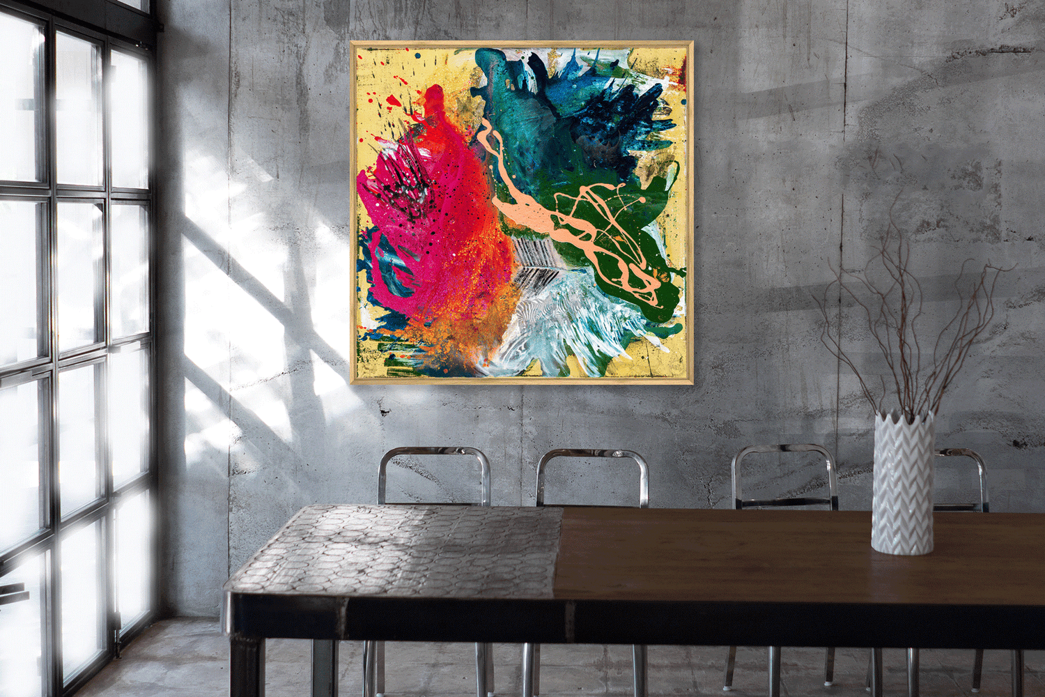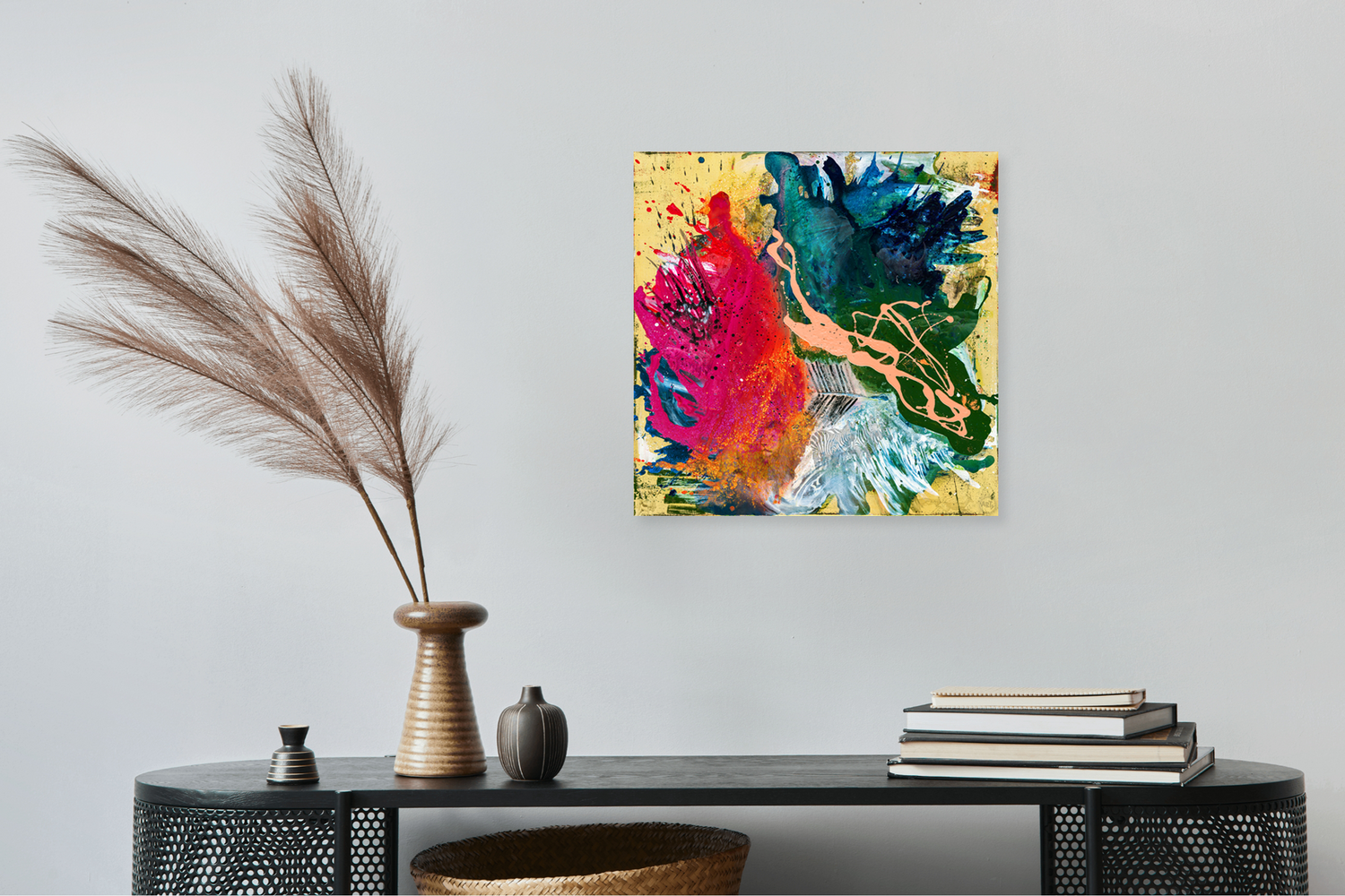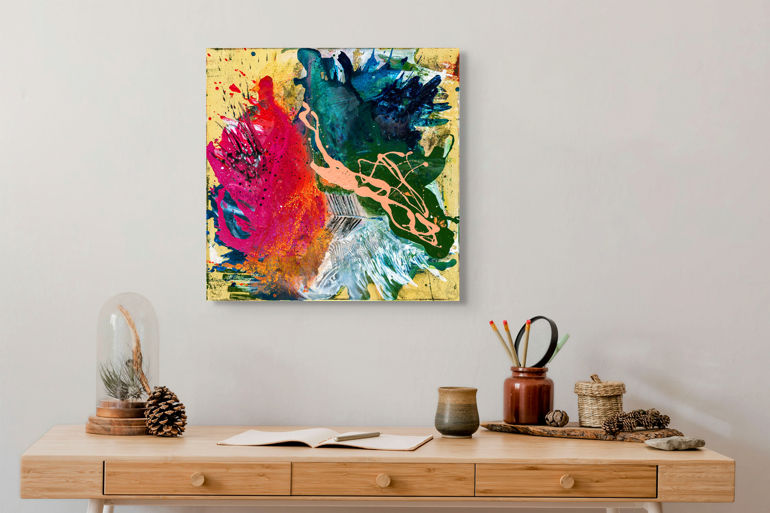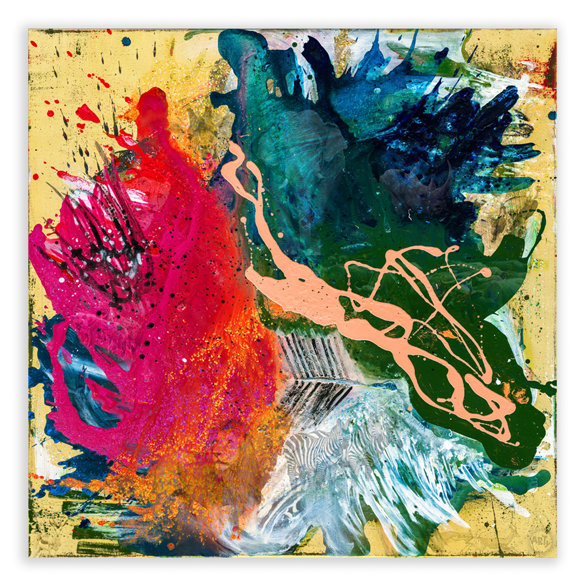 Die Serie ECOSYSTEMS beschäftigt sich mit den beeindruckendsten Ökosystemen unseres Planeten. Das Werk Savanna zeigt eine abstrakte Interpretation des Lebensraums in der Savanne und hat nicht nur eine starke Präsenz im Raum, sondern offenbart auf den zweiten Blick zusätzlich spannende Details: im Bild verstecken sich Tiere, die das Ökosystem charakterisieren und die durch den Einfluss des Menschen bedroht sind.