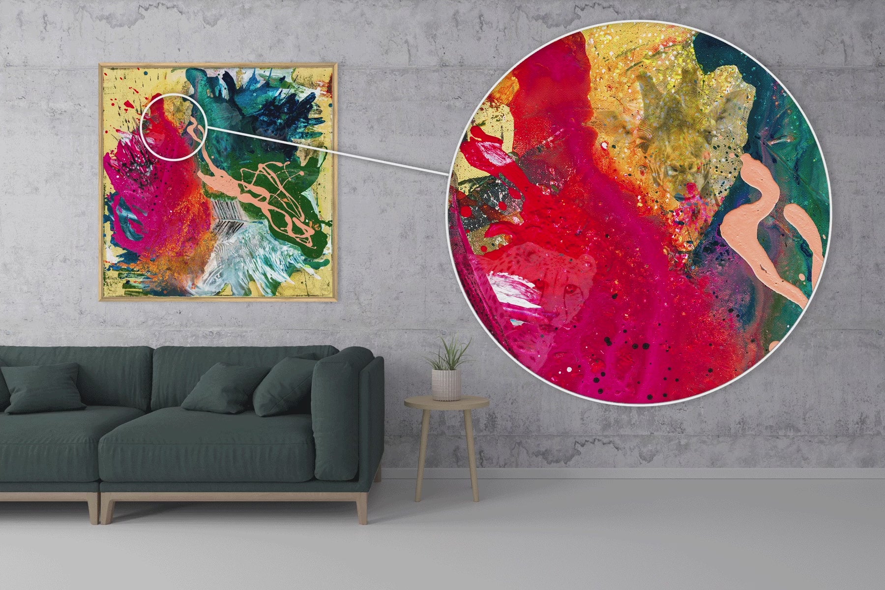 Alle Bilder werden als Drucke geliefert. Die Originale entstehen in unserem Atelier: Grundlage der Werke ist ein abstraktes Bild, das Julia in Mischtechnik und größtenteils mit Acrylfarben auf Leinwand entwickelt.