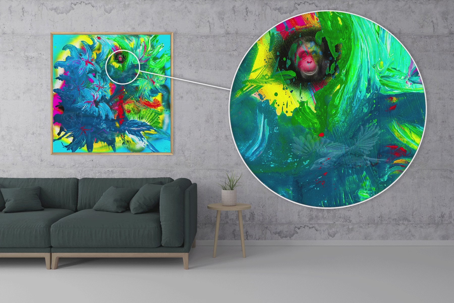 In einem weiteren Arbeitsschritt werden ausgewählte Lebewesen digital in das abstrakte Werk collagiert. Auf diesem Weg entsteht ein außergewöhnliches Gesamtwerk mit einer imposanten Raumwirkung, das in der Detailansicht zusätzlich an Tiefe gewinnt.