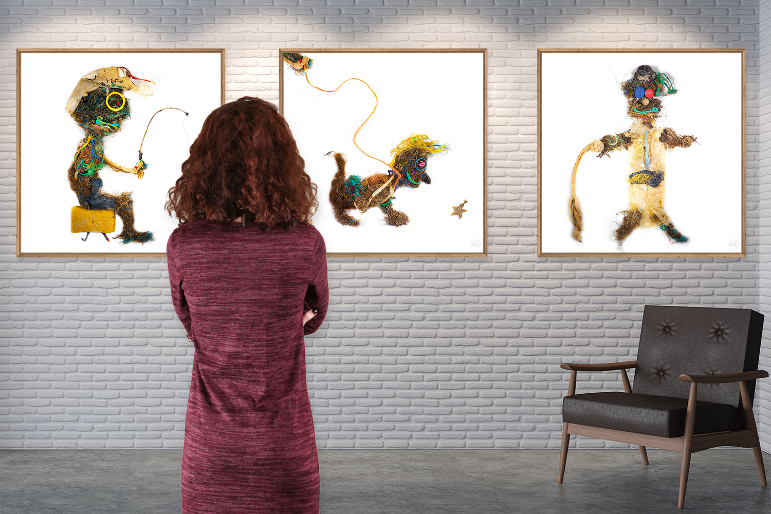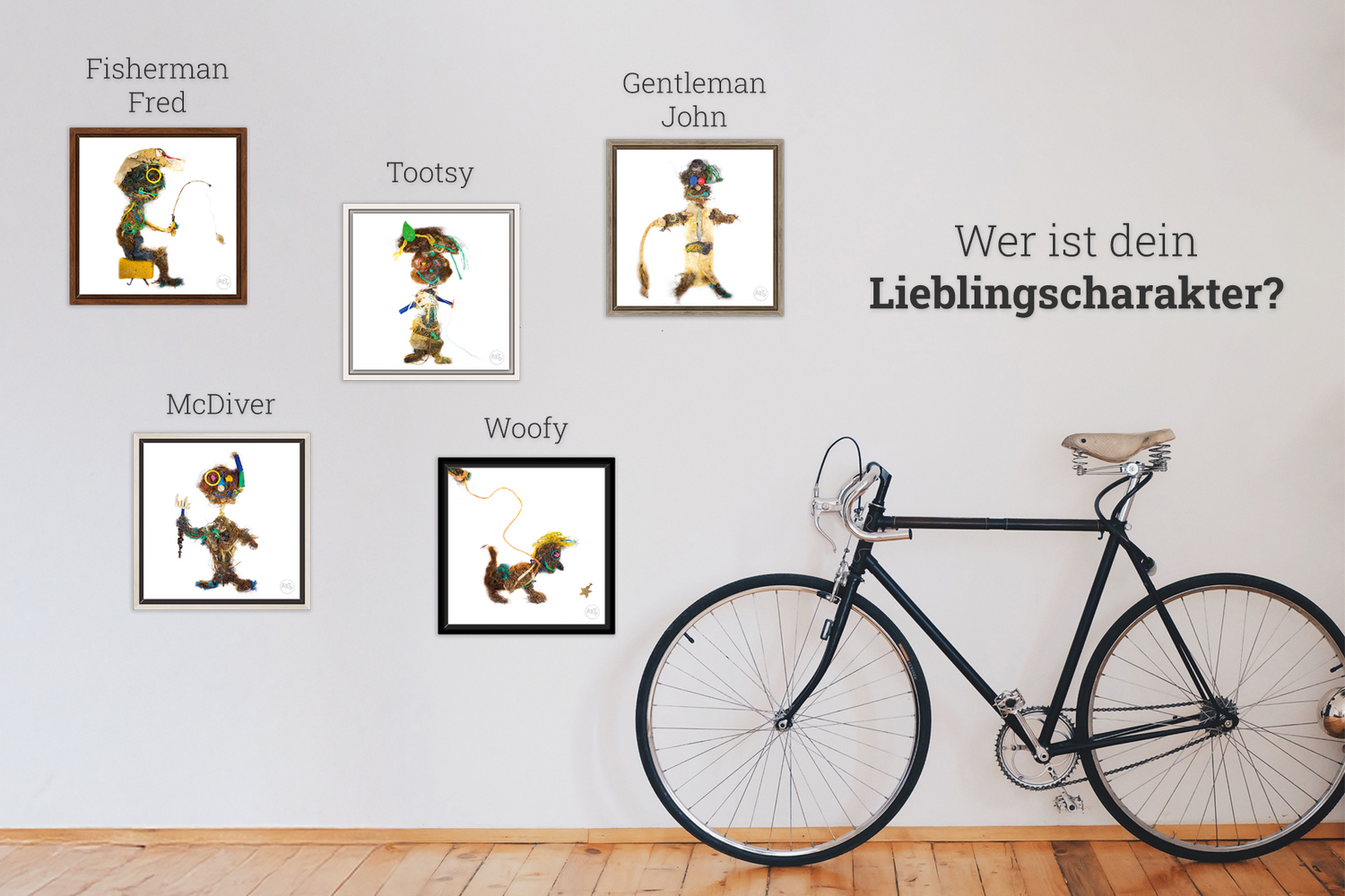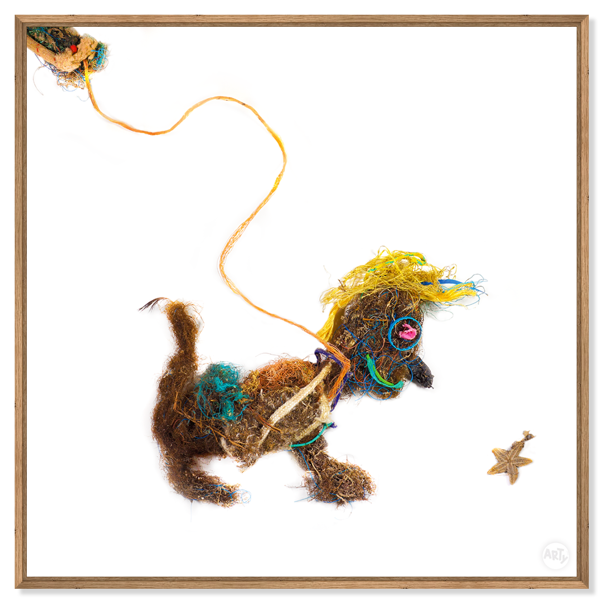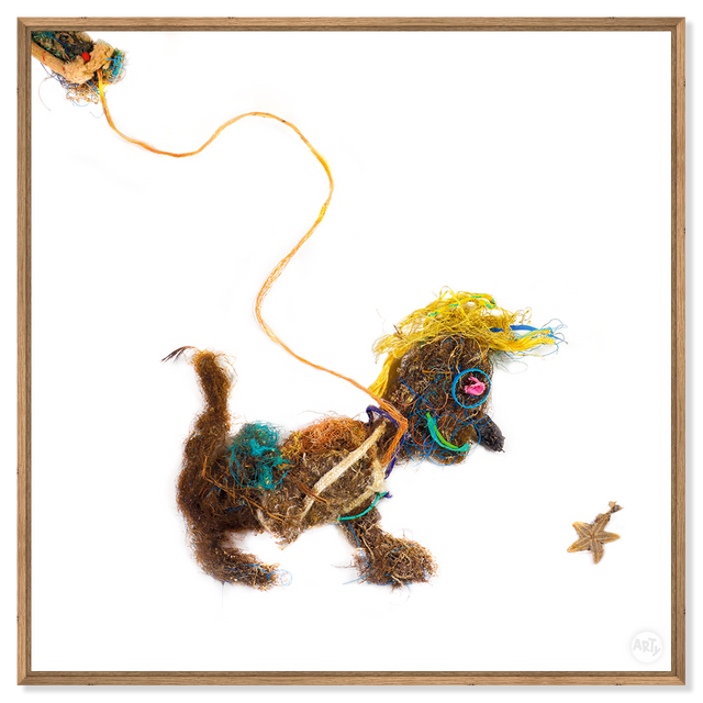 Woofy ist entstanden aus Abfall, alten Fischernetzen, Seilen, Seegras und allem, was die dänische Nordsee an den Strand spült. Er gehört zur Serie der WAQUAS, deren Name sich aus Waste (Müll) und Aqua (Wasser) zusammensetzt. Als sympathischer Charakter strahlt er Optimismus aus, möchte aber gleichermaßen Bewusstsein für die Problematik der zunehmenden Menge an Müll in unseren Meeren schaffen.