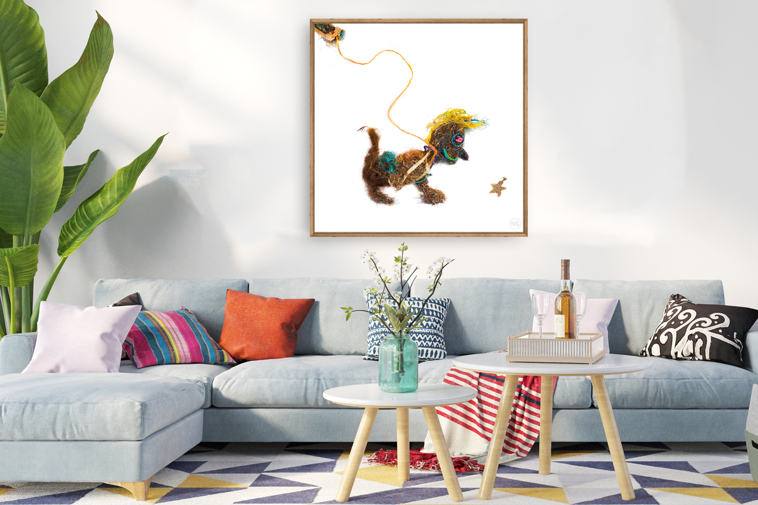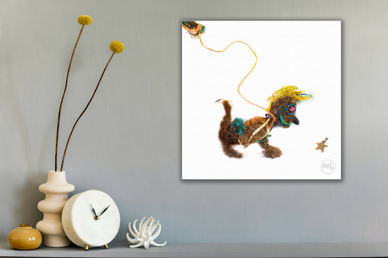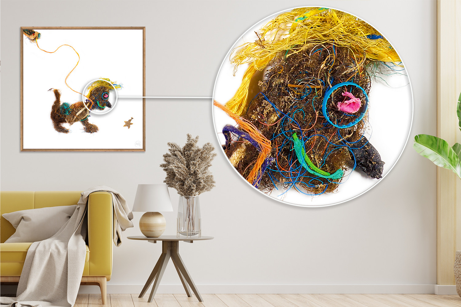 Woofy ist entstanden aus Abfall, alten Fischernetzen, Seilen, Seegras und allem, was die dänische Nordsee an den Strand spült. Er gehört zur Serie der WAQUAS, deren Name sich aus Waste (Müll) und Aqua (Wasser) zusammensetzt. Als sympathischer Charakter strahlt er Optimismus aus, möchte aber gleichermaßen Bewusstsein für die Problematik der zunehmenden Menge an Müll in unseren Meeren schaffen.
